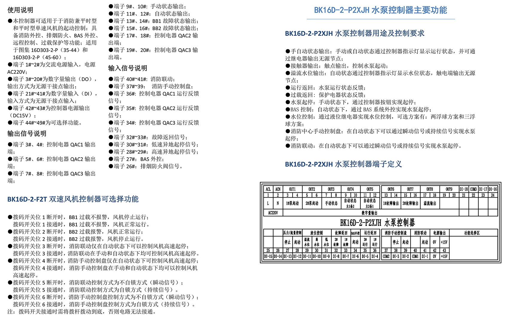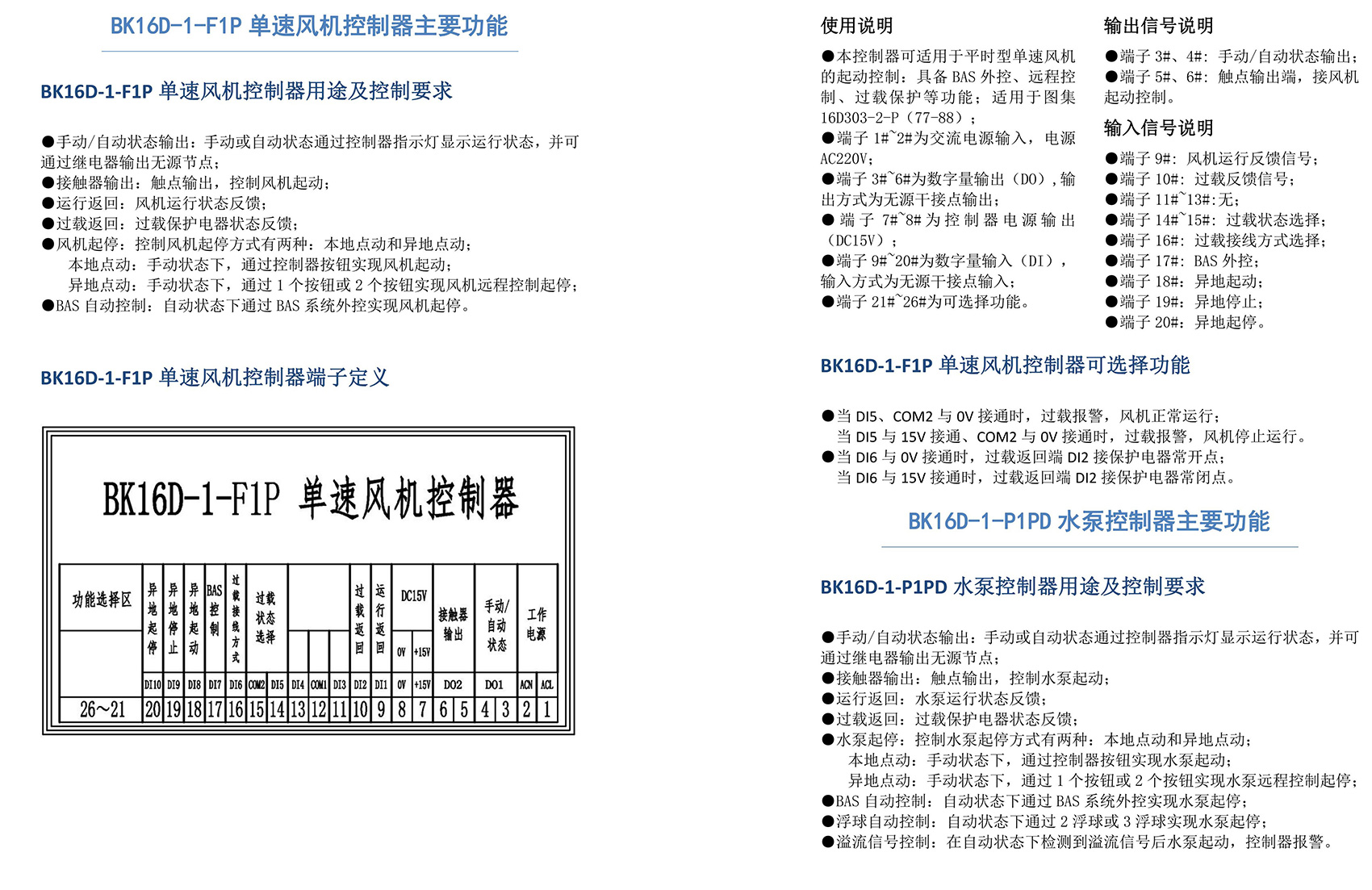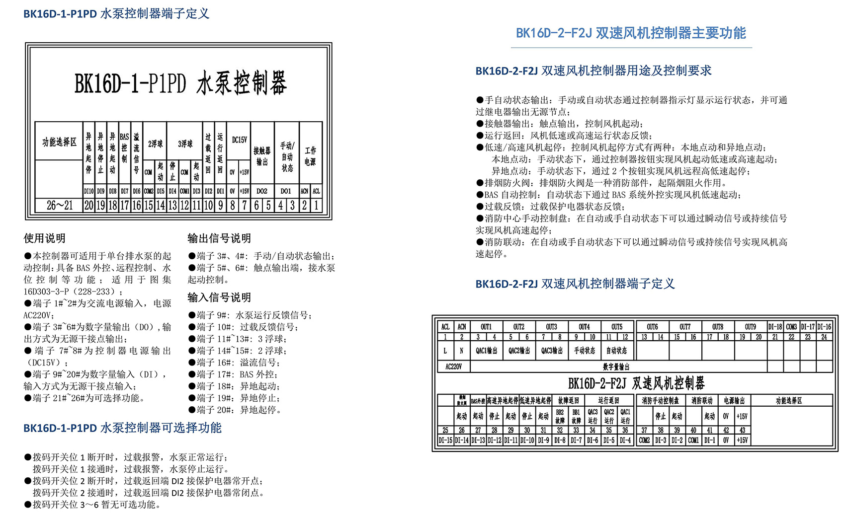 BK16D系列电动设备控制器是一款针对行业风机水泵控制箱设计的系列产品,产品满足国家建筑标准设计图集《16D303-2 常用风机控制电路图》及《16D303-3 常用水泵控制电路图》。本产品采用智能化手段,用逻辑计算代替了传统的按钮、指示灯、转换开关、中间继电器、时间继电器等器件,接线方便,简单快捷。相较于传统的接线方式,本产品可节约硬件投入、减少二次布线、节约工时,并具备故障率低,检修方便。