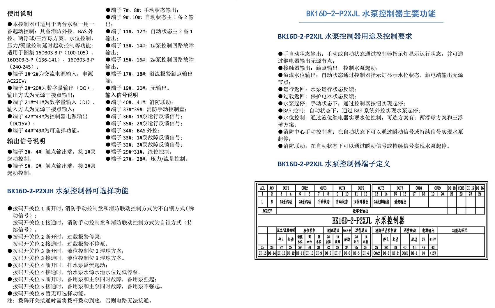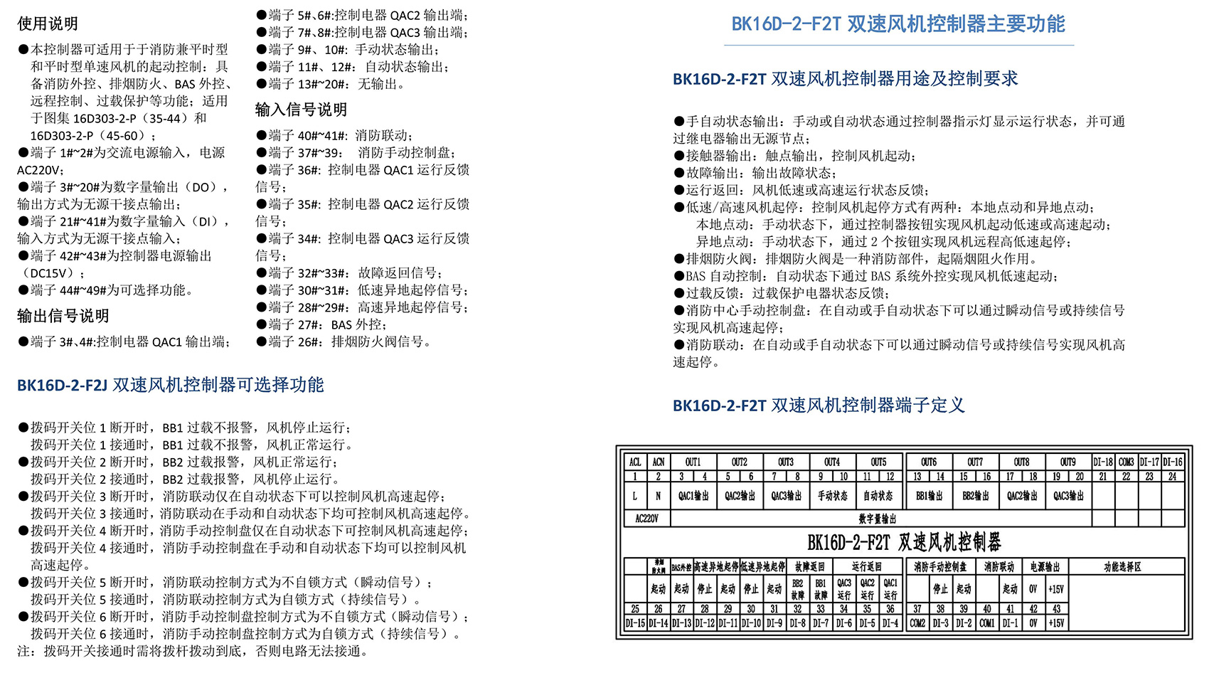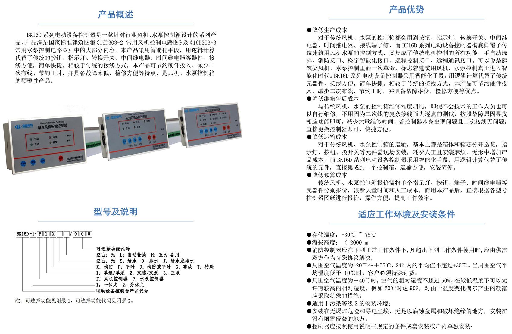BK16D系列电动设备控制器是一款针对行业风机水泵控制箱设计的系列产品,产品满足国家建筑标准设计图集《16D303-2 常用风机控制电路图》及《16D303-3 常用水泵控制电路图》。本产品采用智能化手段,用逻辑计算代替了传统的按钮、指示灯、转换开关、中间继电器、时间继电器等器件,接线方便,简单快捷。相较于传统的接线方式,本产品可节约硬件投入、减少二次布线、节约工时,并具备故障率低,检修方便。