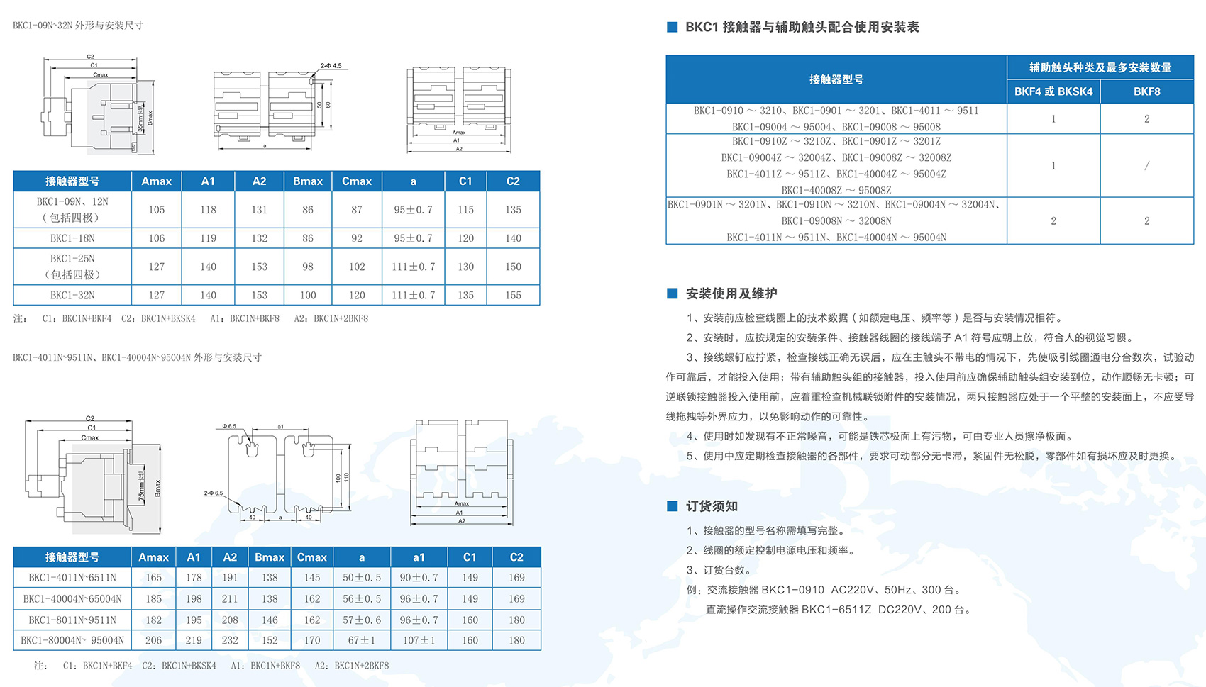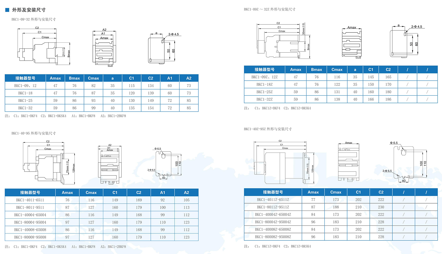 BKC1-09~95系列交流接触器,主要用于交流50Hz(或60Hz),额定绝缘电压为690V,在AC-3使用类别下额定工作电压为380V时额定工作电流为9A~95A的电路中,供远距离接通与分断电路及频繁起动、控制交流电动机;并可与适当的热过载继电器组成电磁起动器,以保护可能发生过负荷的电路。产品符合标准:IEC 60947-4,GB/T 14048.4,IEC 60947-5,GB/T 14048.5